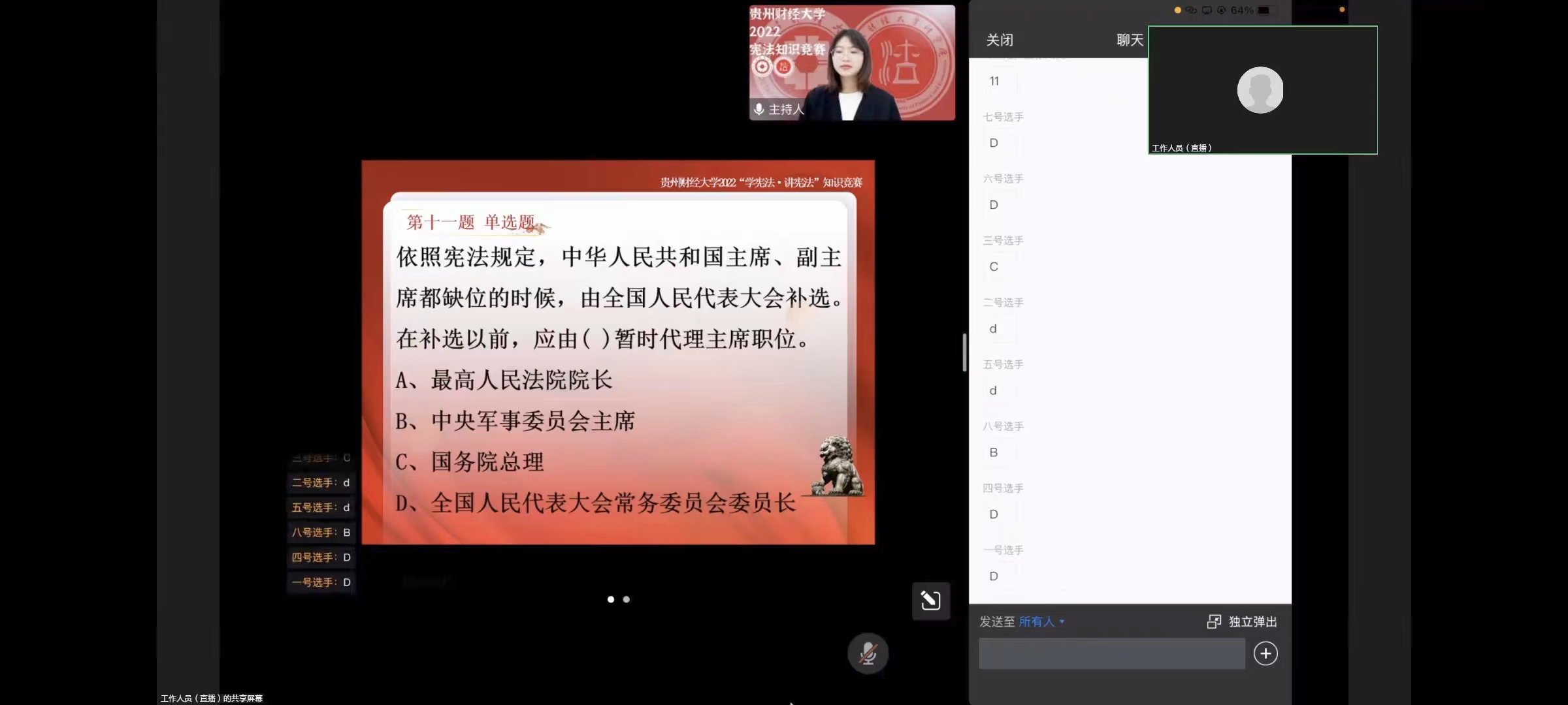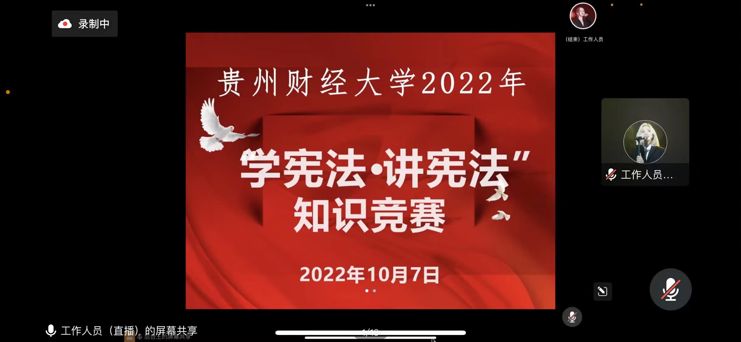 (法学院)为深入学习贯彻新利网页版_新利(中国)法治思想,纪念现行宪法颁布施行四十周年,更好地发挥宪法在全面依法治国和校园文化生活中的重大作用,新利网页版_新利(中国)于10月7日下午举行2022年“学宪法 讲宪法”线上知识竞赛。本次比赛由法学院承办,各学院共计八名选手参赛。全校近200余名师生线上观看了比赛,我院武汉大学法学博士谷骞担任评委。