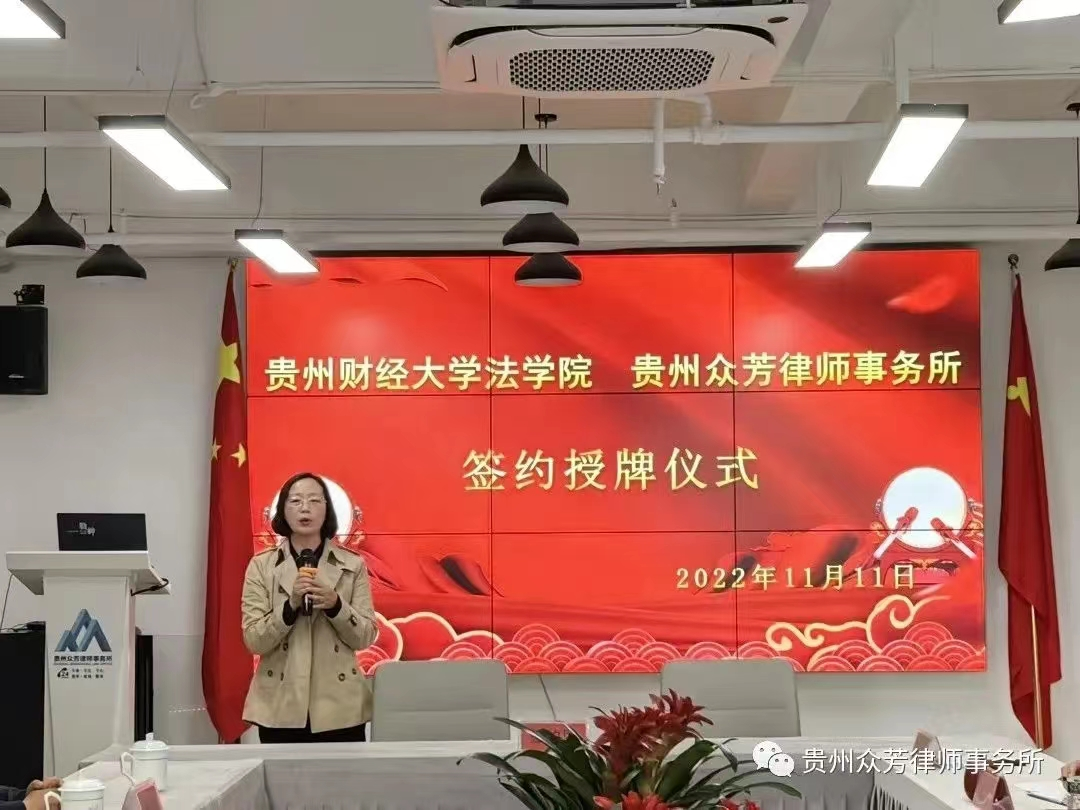 签约暨授牌仪式由陈仕菊主持,陈仕菊首先对陈玉梅一行的到来表示热烈的欢迎和真诚的感谢,并介绍了贵州众芳律师事务所的成立及发展历程。陈玉梅对新利网页版_新利(中国)的成长历史及师资力量做了系统的介绍,并表示希望以设立校外实践教学基地的方式丰富教学内容,加强教学理论与实践的结合,提高学生综合素质和社会适应能力。