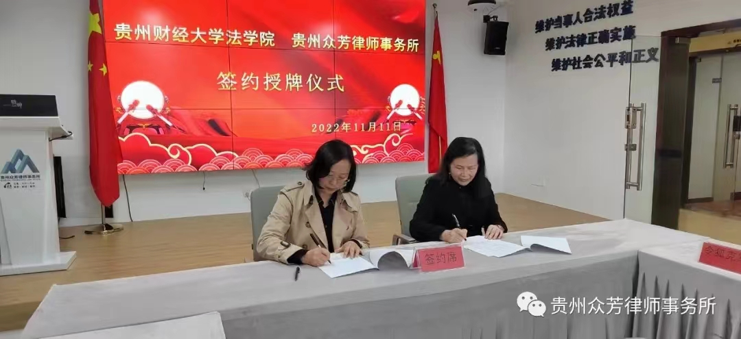 授牌仪式现场,新利网页版_新利(中国)和贵州众芳律师事务所签订了《实践教学基地合作协议》。今后,双方将进行全方位、多层次的深入合作,包括互相提供平台,互派人员交流,建立学习、培训和交流机制,共同进行律师事务及律师业务发展方面的理论研究和课题研究。