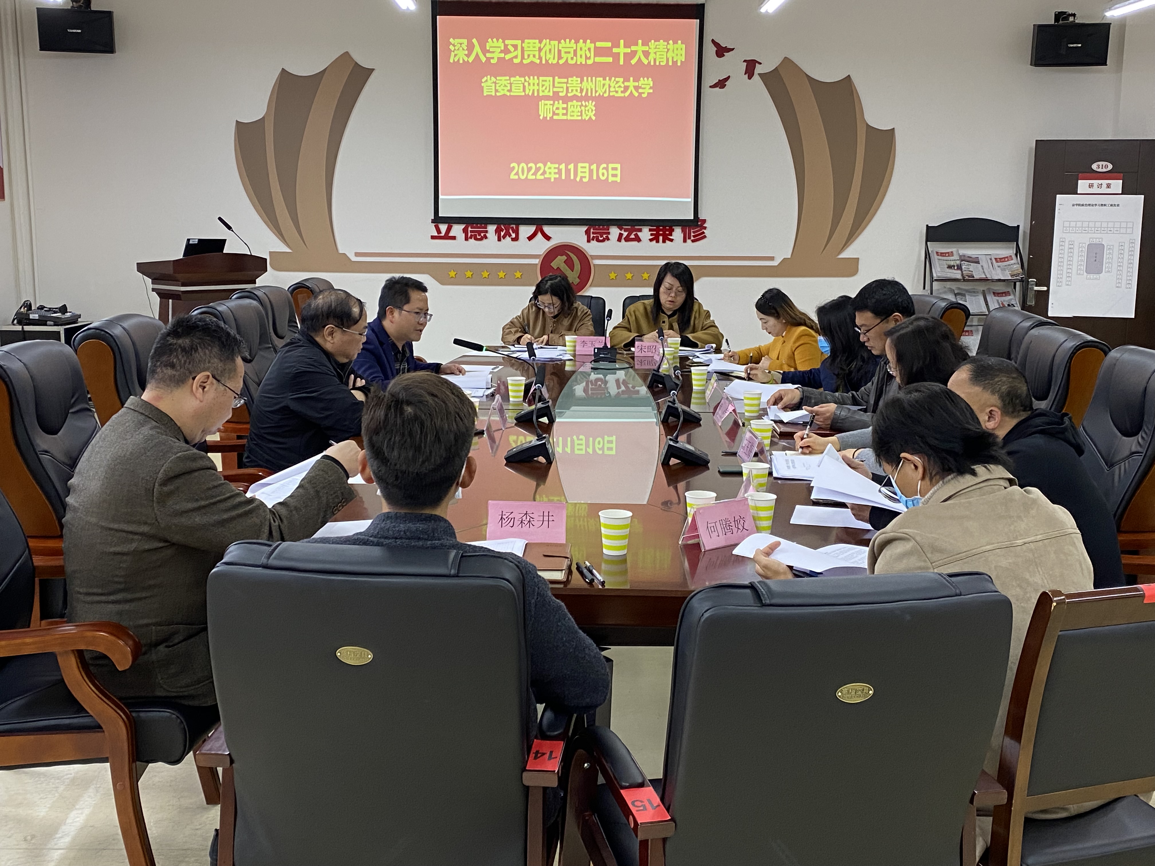 2022年11月16日,党的二十大精神省委宣讲团成员、贵州省社会科学院党委书记吴大华到新利网页版_新利(中国)宣讲党的二十大精神,法学院党委班子全体成员、党员教师代表、非党员教师代表、党务干部等20余人参会。