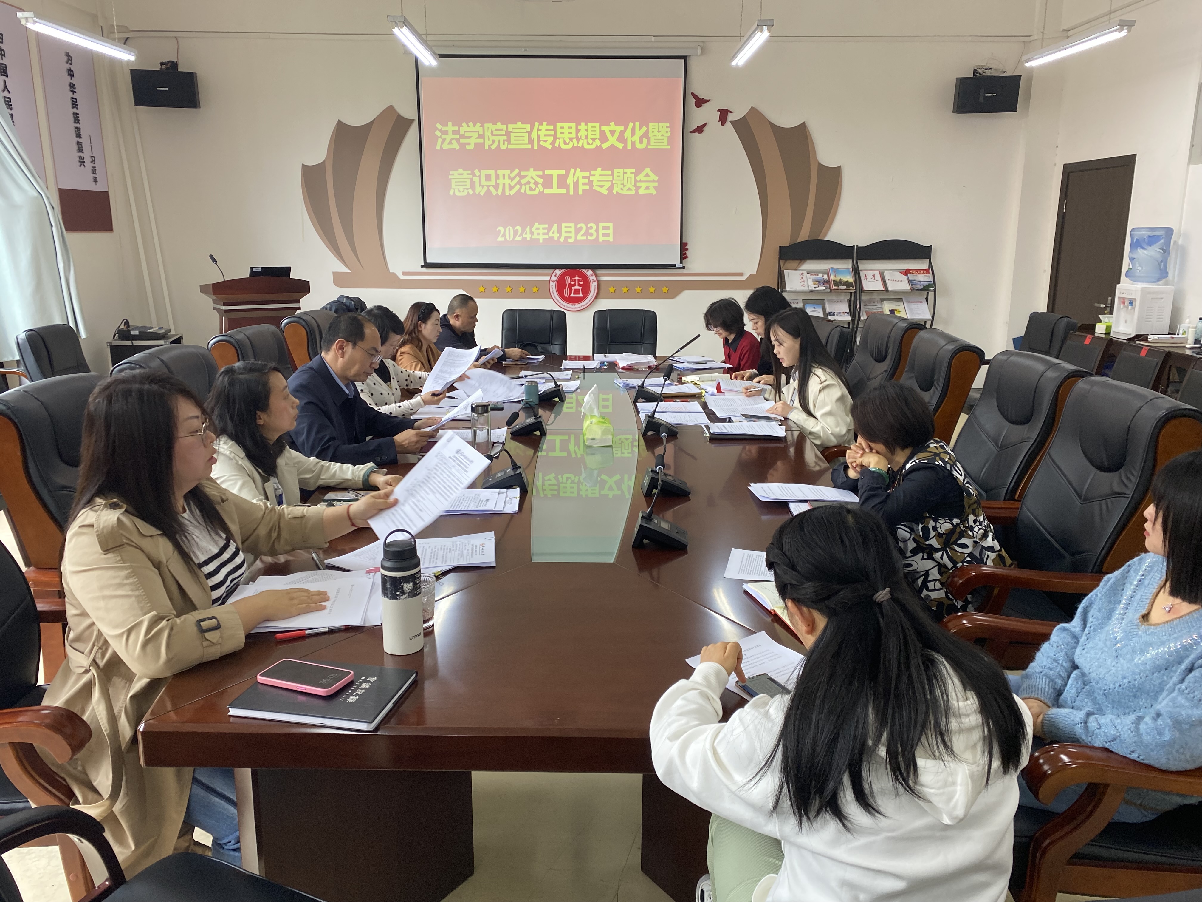 (法学院 图文/报道 莫丹洵)4月23日上午,法学院在文德楼A8-310会议室召开2024年上半年宣传思想文化暨意识形态工作专题会议,党委班子成员、各科室负责人、系负责人、党支部书记等参加会议,会议由院党委书记邵新顺主持。